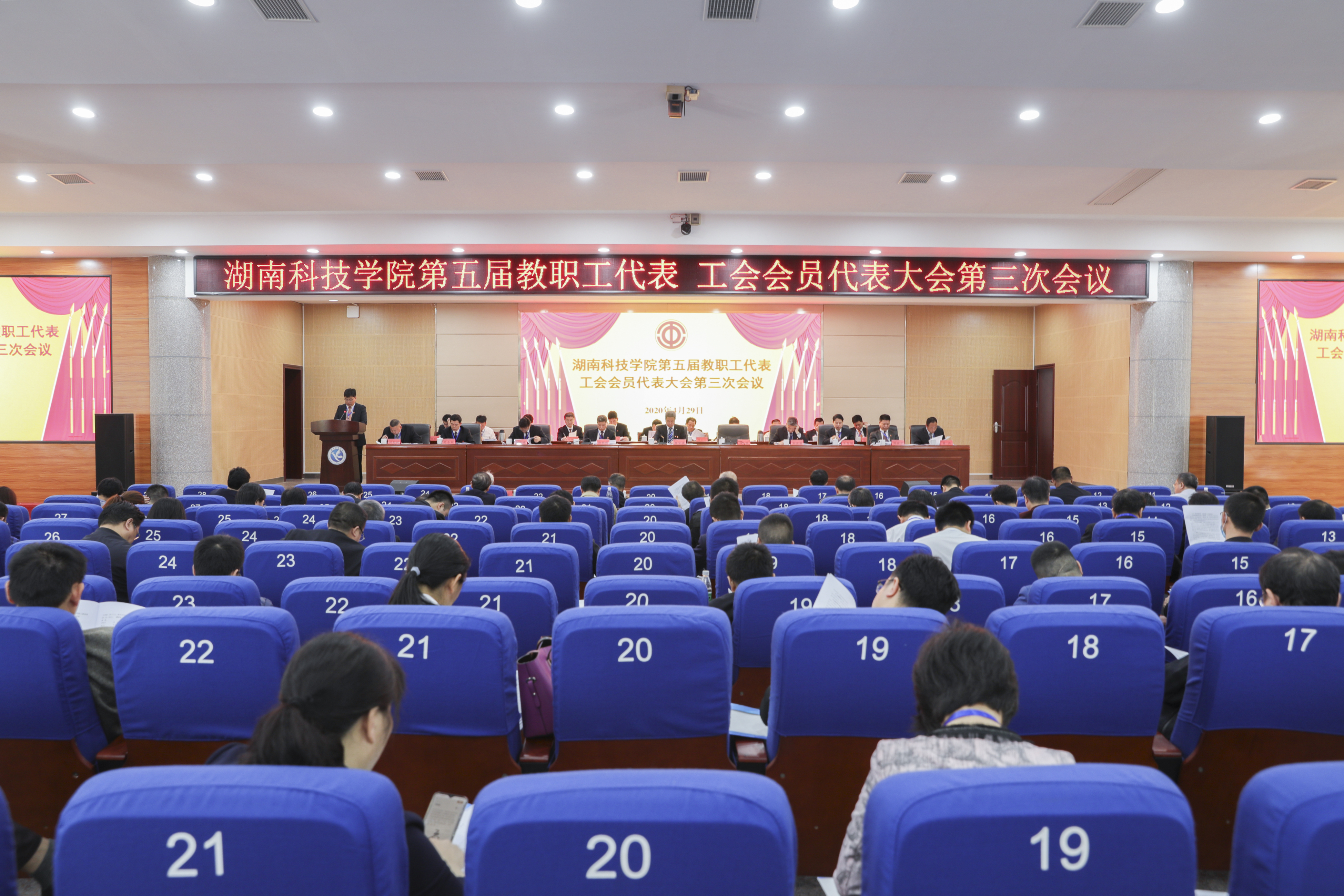 4月29日上午,学校第五届教职工代表工会会员代表大会第三次会议在潇湘大讲堂开幕。大会主席团成员曾宝成、李钢、唐艳明、宋宏福、彭立威、李常健、吴小林、程智开、何福林、杨涛等 21人在主席台就坐。正式代表、特邀代表和列席代表200余人齐聚一堂,共商学校改革发展大计。