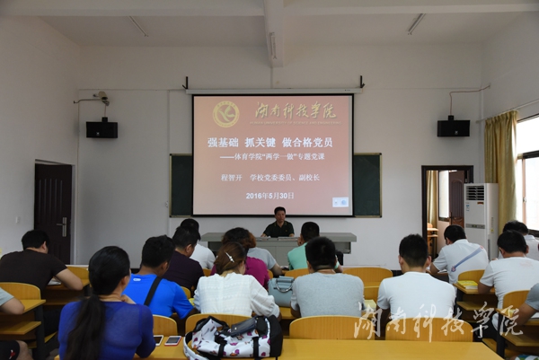 5月30日下午,党委委员、副校长程智开为体育学院全体师生党员上专题党课。