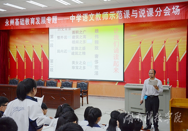 示范课与说课分会场上, 永州市一中教师李立以《阿房宫赋》为教学内容,通过诵读和仿写让学生体会赋的“铺采摛文”的特点。老师的幽默授课和学生的积极主动相映成趣,互动良多,欢声笑语不断。双牌县二中教师叶国嫒以《诵读、品读、多维解读——< 氓>赏读》为内容,从教学分析、策略选择、过程实施和效果反馈四个方面展开说课。她从学生感悟能力和文本价值的交切点入手,由浅入深,引导学生品读诗歌,以读带品,以品促读。