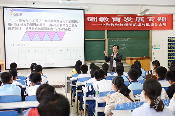 永州市九中伍振军老师现场精彩讲解了《函数的表示法》,他由浅入深,图像与文字相结合,以通俗易懂的实例来阐释函数的定义,并设置相关例题对解题思路进行详细讲解。接履桥中学尹祖梅老师的说课《圆与圆的位置关系》更是生动形象,依托多媒体进行大量动画设计,把静态的知识动态化,围绕课题的核心内容层层展开,知识环环相扣,步步深入,让学生直观形象的理解知识的形成过程。