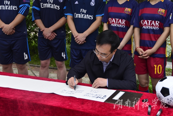 本网讯(通讯员 吴秋月)4月28日,“校园足球文化”艺术作品展在爱莲湖畔举行。校党委书记陈弘兴致勃勃地来到现场观展并深情寄语“足球魅力无穷,生命潜力无限”,展览吸引了众多师生纷纷驻足。