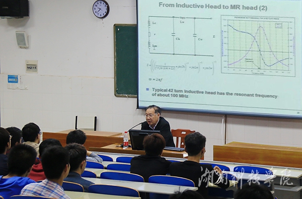 在逸夫楼201教室,黄厚斌先生为电子与信息工程学院的师生们作题为《计算机硬盘驱动器概述及镀膜磁头的数据模型》的学术讲座,详细介绍了磁性镀膜磁头的工作原理、磁性硬盘和固态驱动器的比较、镀膜磁头的数据模型及他本人的科研等内容。