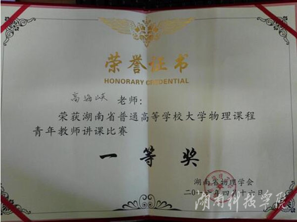 此次比赛由教育部高等学校大学物理课程教学指导工作委员会和湖南省物理学会举办,4月16日在中南大学举行预赛。经过激烈角逐,高海峡喜获佳绩,将与中南大学、湖南大学两位老师共同代表湖南省参加中南地区复赛。