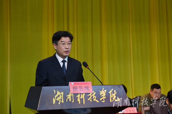 党委副书记、校长曾宝成作题为《聚焦目标任务,狠抓工作落实,为建设高水平应用型大学打下坚实基础》的工作报告。曾宝成在报告中总结回顾了去年学校工作。他指出,2015年,学校在省委省政府的正确领导下,全校上下认真贯彻落实党的十八大和十八届三中、四中、五中全会精神,深入学习贯彻习近平总书记系列重要讲话精神,遵循“六精”战略布局,励精图治,攻坚克难,圆满完成了学校《章程》核准与颁布、第三次党代会召开、干部竞聘上岗、绩效工资改革等在学校发展史上具有重要意义的一系列大事,在思想政治工作、人才培养、学科建设、科学研究、社会服务、内部管理等方面取得了可喜成绩,呈现出良好发展势头和广阔发展前景。