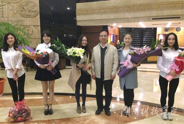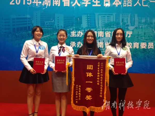 本网讯 11月7日,在2015年湖南省大学生日语演讲比赛中,我校日语专业学生彭紫薇、邓妩媚、刘佳男分获四年级组、三年级组、二年级组个人一等奖,并以总分第一的成绩荣获团体一等奖。校党委书记陈弘对获奖学子及团队表示祝贺,希望大家再接再厉,不断实现自我、超越自我,再创辉煌。