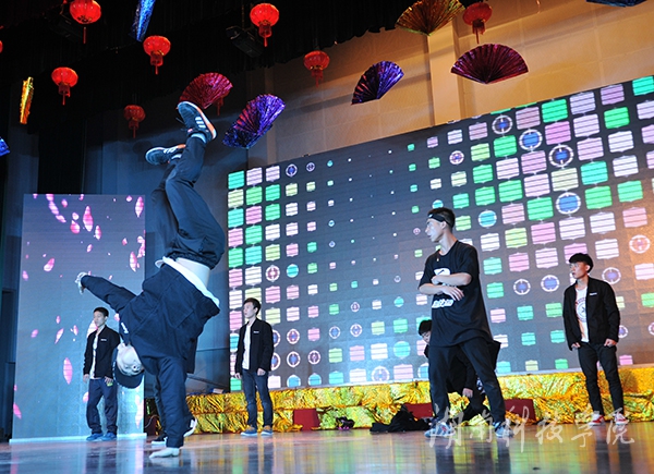 晚会在由风荷艺术团管乐团带来的《加勒比海盗》·《自由之神序曲》拉开序幕,婉转跌宕的音律,磅礴恢弘的气势将现场师生带入唯美的音乐梦境中;教工团总支带来的快板《欢声笑语赞科院》,让新生们再一次对即将伴随自己四年的母校有了更新的认识;经济与管理学院、理学院、外国语学院的表演者们则以“舞力对决”的形式各自上场,用时下流行的韩舞和街舞互相PK,绚丽热辣的街舞表演将晚会推向高潮;“绿草苍苍,白雾茫茫,有位佳人,在水一方……”