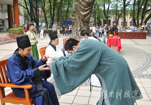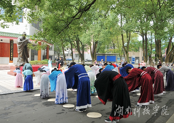 此次祭孔大典,以“礼”为主题。在颇具古典韵味的奏乐声中,学子们向孔子像行正规揖礼,一叩首“华夏文明,德牟天地”;二叩首“先圣师道,功过古今”;三叩首“格物致知,修齐治和”,并向师者行鞠躬礼,仪式庄严古朴,严格按照祭孔礼制进行祭祀。