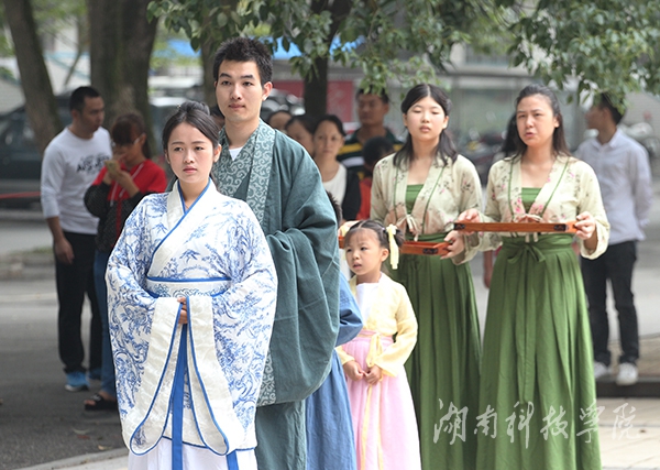 期间,汉服爱好者穿汉服在校园行走,让汉服文化进课堂、进图书馆。