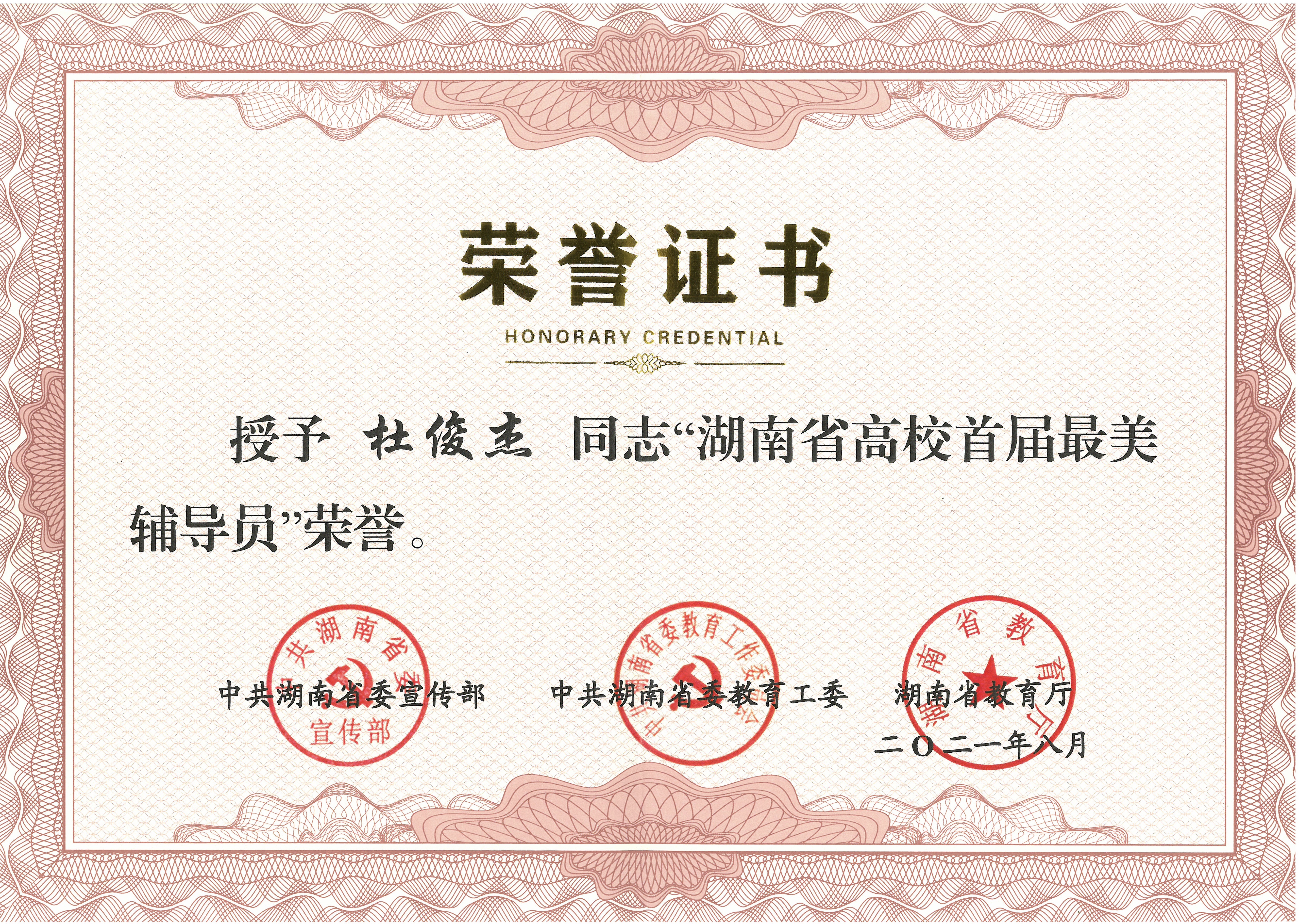 【名片】杜俊杰,中共党员,2015年研究生毕业进入久久不卡区工作,现任理学院党总支组织委员、2020级辅导员、学工办副主任。2018年4月,参与的“‘心晴’特色成长辅导室”被评为湖南省大学生思想道德素质提升工程优秀建设项目;2019年11月,获第六届湖南省青年文化艺术节绘画类国画组铜奖;2021年6月获评2020湖南省高校辅导员年度人物。2021年8月获评首届“最美辅导员”。